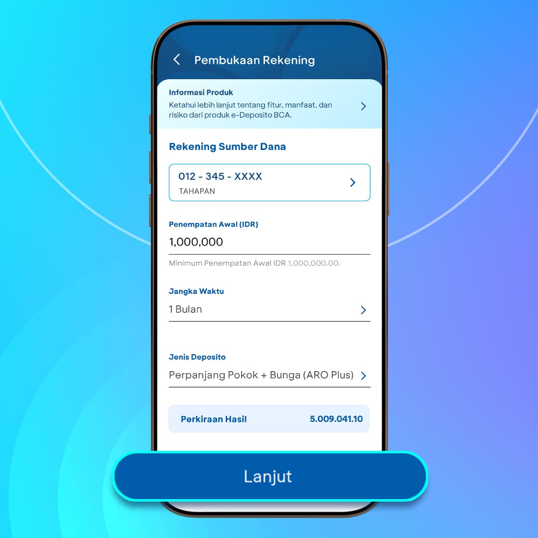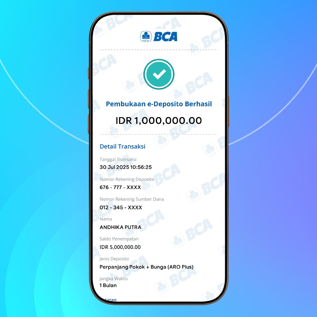 Kamu bisa bertransaksi dimanapun dan kapanpun tanpa harus datang ke kantor cabang. Cukup dari digital platform myBCA yang bisa kamu akses dari aplikasi mobile atau website, pembukaan e-deposito dapat dilakukan setiap hari.