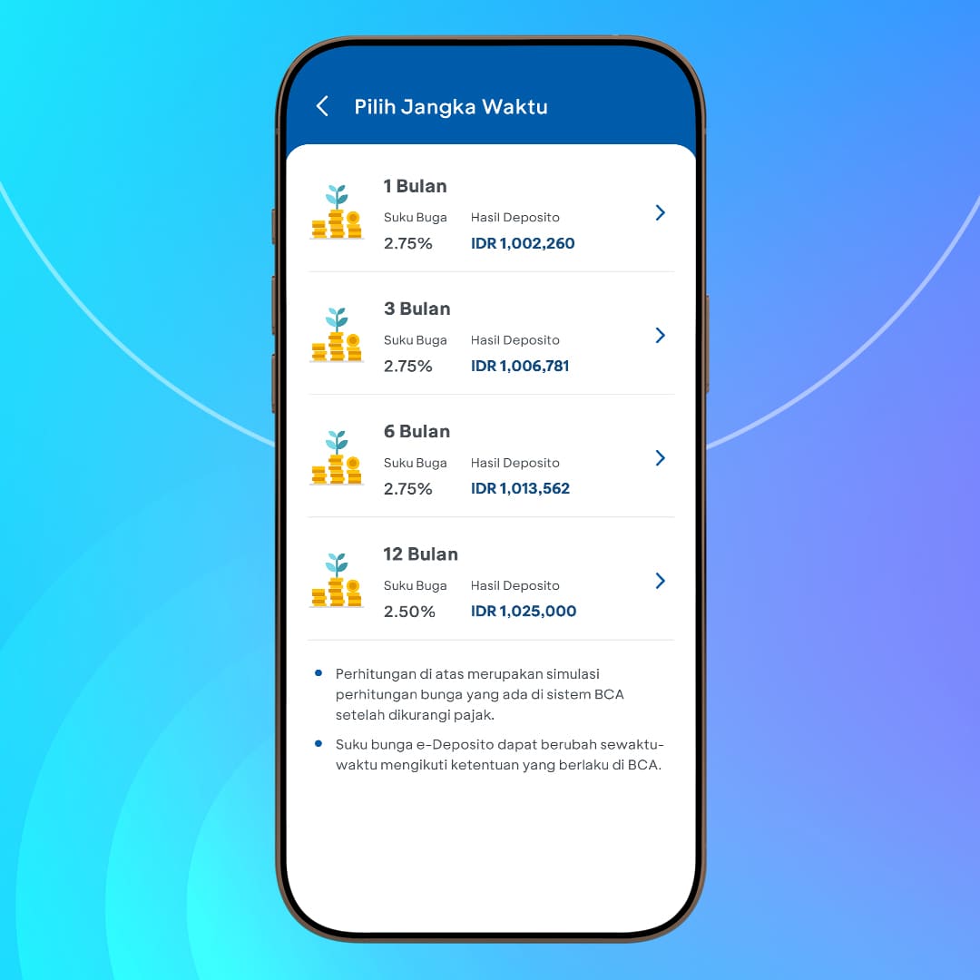 - Fleksibel. Jangka waktunya bisa dipilih sendiri, bisa 1, 3, 6, atau 12 bulan. Selain itu, bisa juga memilih metode perpanjangan. Kalau dana pokoknya saja diperpanjang otomatis dengan jangka waktu yang sama, dan bunganya ditransfer ke rekening kamu, namanya e-Deposito ARO. Kalau nilai pokok serta bunganya didepositokan kembali itu namanya e-Deposito ARO Plus.
