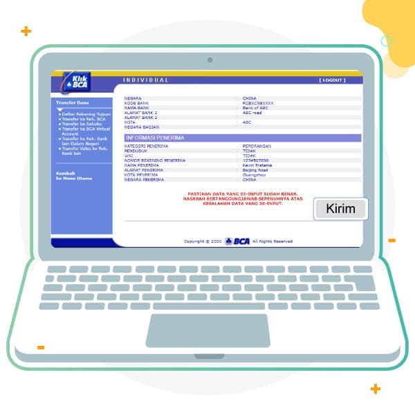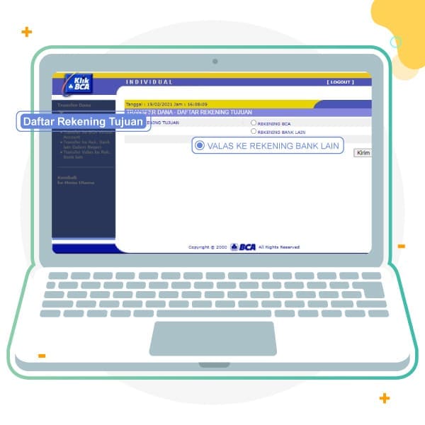 Saat ini, KlikBCA melayani pengiriman valas dalam 14 mata uang asing, antara lain AUD, CAD, CHF, CNY, DKK, EUR, GBP, HKD, JPY, NZD, SAR, SEK, SGD, USD dengan kurs cantik dan biaya yang kompetitif.
