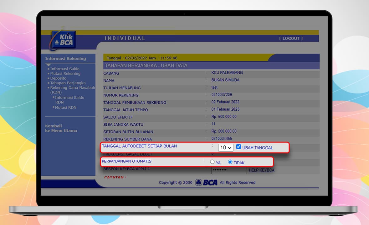 Untuk memudahkan kebiasaan menabung di kalangan generasi muda, kini perpanjangan Tahapan Berjangka BCA bisa dilakukan via KlikBCA, lho. Dengan kata lain, buat yang punya rekening Tahapan Berjangka BCA dan sebentar lagi akan jatuh tempo, tidak perlu repot lagi datang ke cabang kalau tidak sempat. Langsung saja perpanjang Tahapan Berjangka kamu via KlikBCA, tanpa merubah jangka waktu dan jumlah autodebet setoran bulanan. Selain itu, kini bisa ubah data tanggal pendebetan Tahapan Berjangka melalui melalui KlikBCA juga, lho.