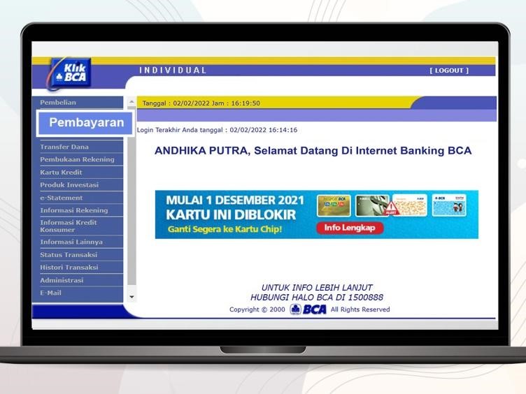 - Masukkan user ID dan password pada KlikBCA, kemudian pilih menu Pembayaran