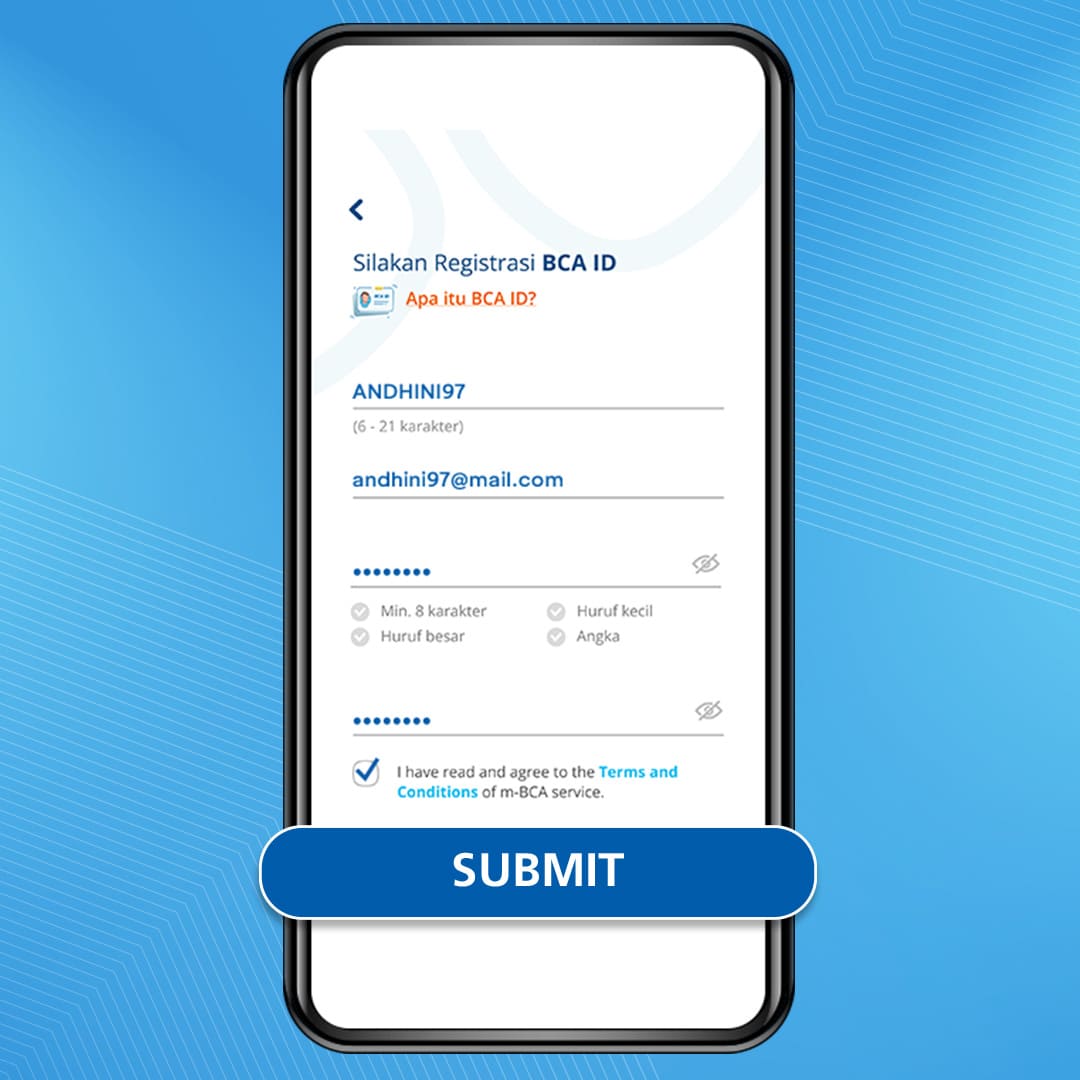 - Tentukan BCA ID, email dan password yang diinginkan, centang Syarat & Ketentuan