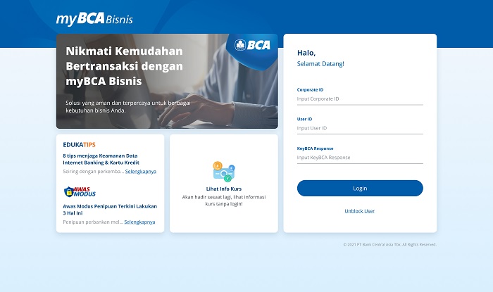 Untuk melakukan login myBCA Bisnis, 3 hal ini diperlukan: Corporate ID, User ID, KeyBCA Response. Nasabah dapat memperoleh KeyBCA Response melalui Appli 1 token KeyBCA. Berikut langkah untuk login myBCA Bisnis: