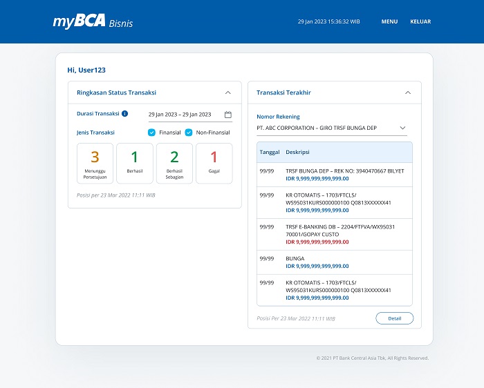 Dengan layanan myBCA Bisnis, nasabah bisa melihat ringkasan status seluruh transaksi dalam satu business dashboard, tampilannya pun terlihat modern dan user friendly sehingga mudah digunakan oleh siapa pun. Bukan hanya itu, proses loginnya pun cukup seamless melalui perangkat pribadi.