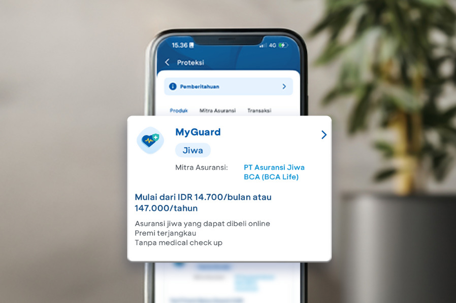 BCA bekerja sama dengan BCA Life dalam menghadirkan MyGuard, asuransi jiwa digital dan beragam pilihan tambahan manfaat yang dapat disesuaikan dengan kebutuhanmu. Dengan premi mulai dari Rp14 ribuan/bulan, proteksi finansialmu tanpa medical check up.