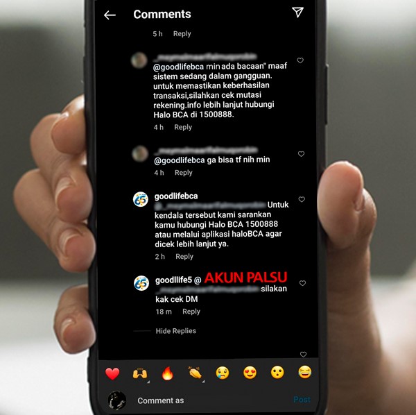 Direct message (DM) sering dijadikan sarana bagi para oknum untuk menjangkau target mereka. Akun-akun ini kerap kali meminta data pribadi dengan iming-iming untuk membantu nasabah yang sedang mengalami kendala atau bahkan untuk pengiriman hadiah tertentu. Perlu diingat bahwa BCA tidak pernah meminta data nasabah, seperti nomor kartu debit bca/kartu kredit BCA, masa berlaku kartu, CVC/CVV (3 digit angka dibelakang kartu) kode OTP, PIN, password, dll.