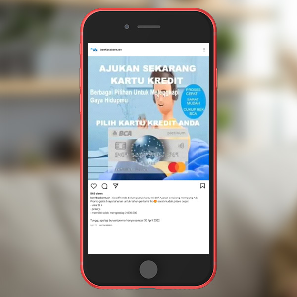 Di media sosial, khususnya di Instagram, beredar iklan dari akun palsu yang mengatasnamakan BCA dan menawarkan apply kartu kredit BCA. Tujuannya untuk memancing korban agar tertarik dan mau memberikan data-data perbankan seperti nomor kartu ATM, PIN m-BCA, kode OTP dll. guna mengambil alih akun BCA mobile milik korban.