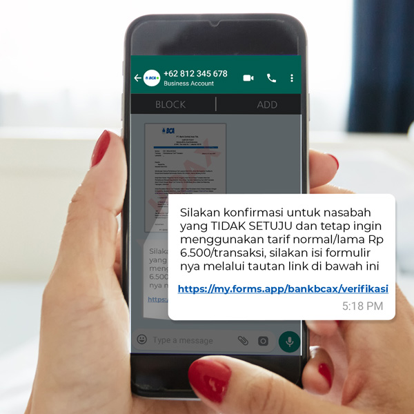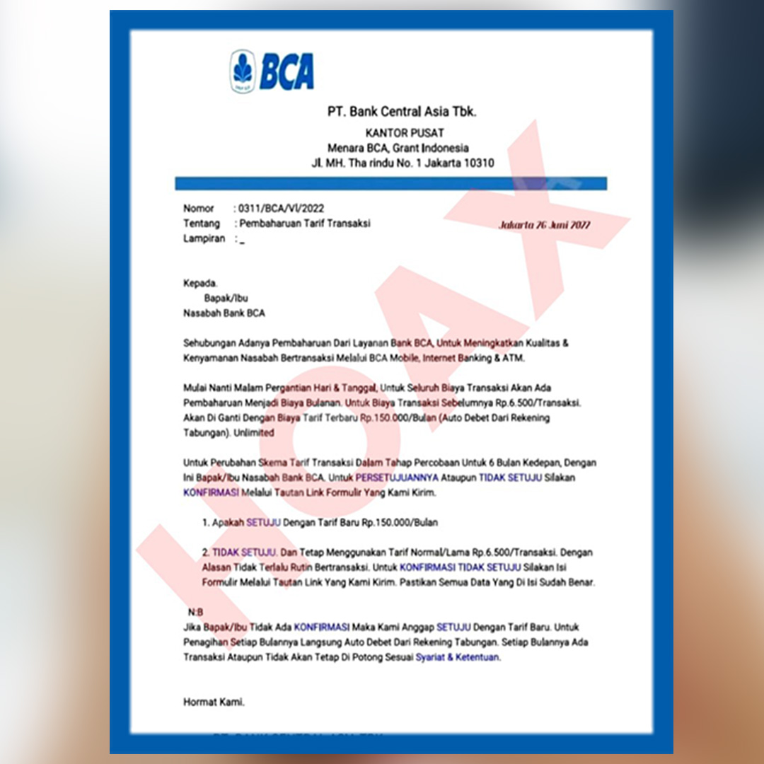 Waspada ya sekarang sedang banyak beredar Hoax ‘Surat Resmi Kenaikan Tarif Transaksi’ yang mengatasnamakan Bank BCA dan disebarkan oleh oknum-oknum penipu yang tidak bertanggung jawab melalui sarana WhatsApp, email, bahkan media sosial!