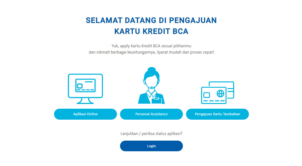 - Bagi nasabah yang belum memiliki kartu kredit BCA dan ingin melakukan apply kartu kredit BCA, dapat dilakukan secara online melalui website resmi BCA . Informasi lengkapnya kamu bisa cek di sini.