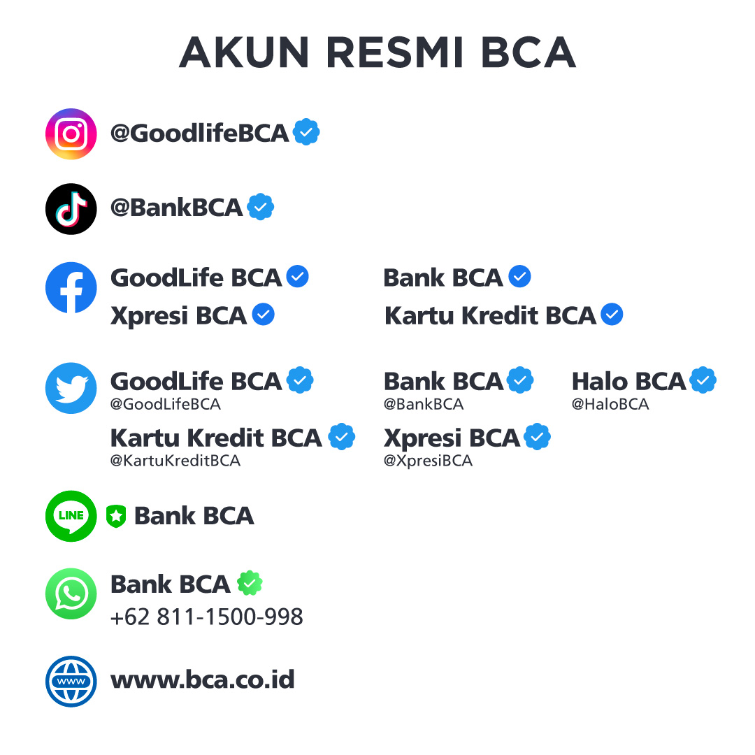 • Facebook: @GoodlifeBCA, @BankBCA, @XpresiBCA, @KartukreditBCA