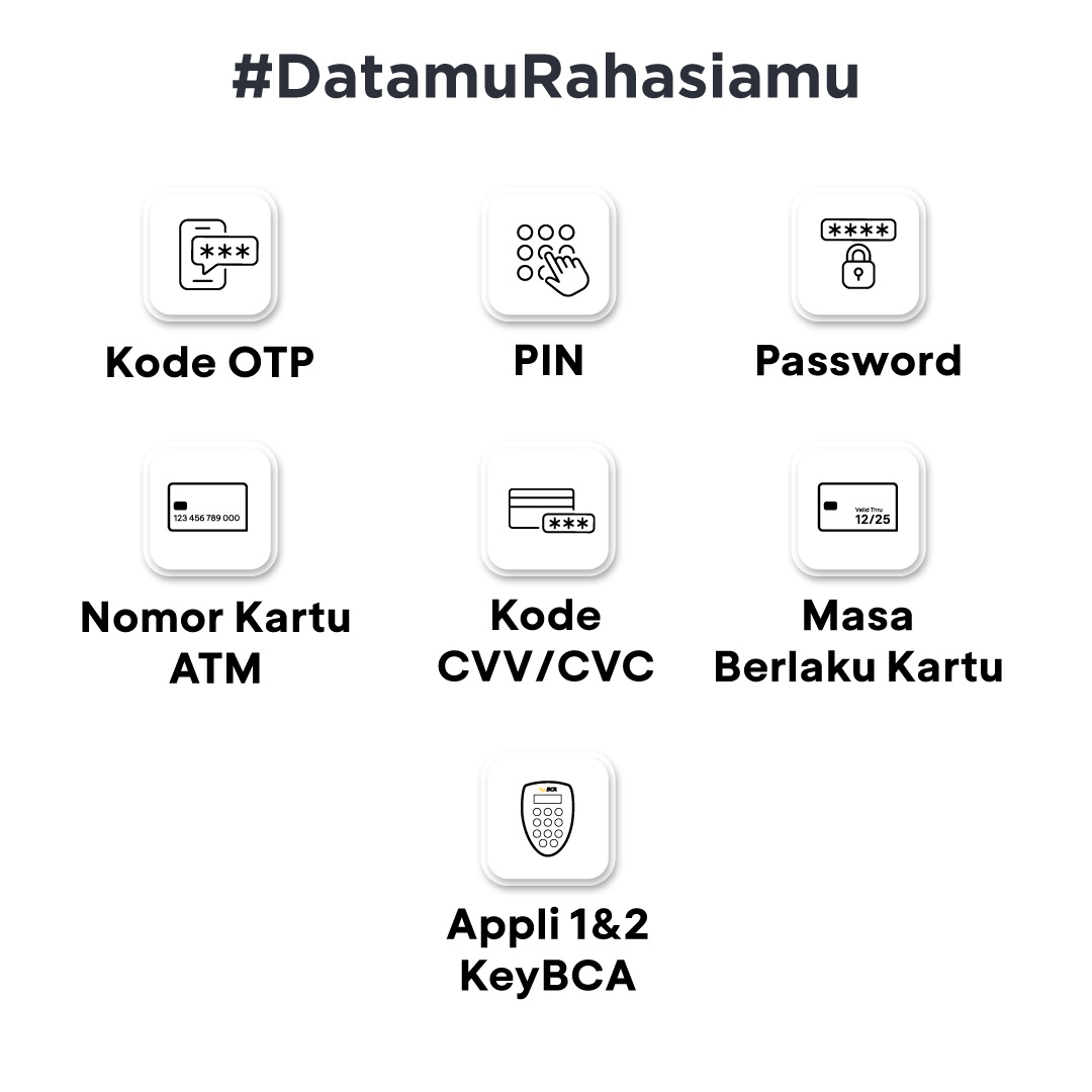 Ingat! BCA tidak pernah meminta data-data perbankan yang bersifat rahasia di atas melalui sarana apapun. Kelalaian dalam menjaga data-data tersebut dapat menyebabkan pembobolan rekening atau kartu kredit oleh penipu. #DatamuRahasiamu