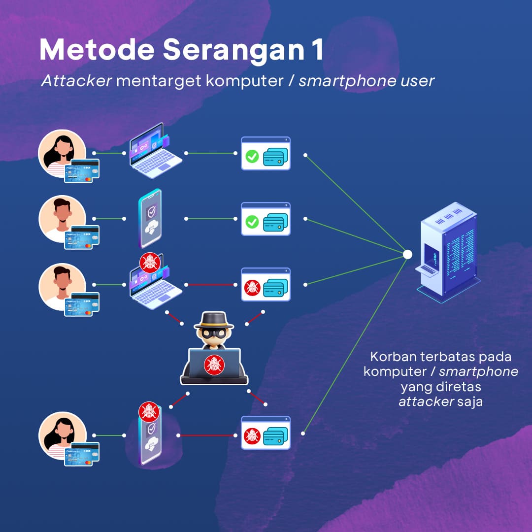 Karena attacker menyerang ke perangkat komputer / smartphone, korban terbatas hanya pada pemilik kartu yang komputer / smartphone nya diserang.