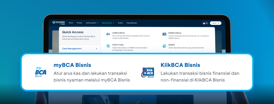 Sebagai bank yang selalu senantiasa di sisi nasabah, BCA memahami digitalisasi yang terjadi dalam bisnis. Oleh karena itu, BCA menghadirkan dua produk penting bagi bisnis, yaitu myBCA Bisnis dan KlikBCA Bisnis.