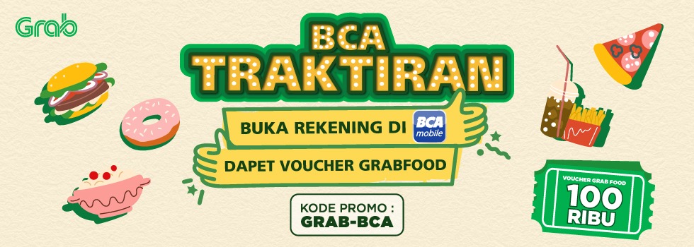 Mau makan GrabFood ditraktir BCA? Ikutan BCA Traktiran aja. Caranya gampang banget, kamu hanya tingal pilih kode promo GRAB-BCA saat buka Tabungan di BCA mobile. Setelah pembukaan Rekening via BCA mobile disetuju, lalu kamu transaksi di BCA mobile (m-Transfer/ m-Payment/m-Commerce) maksimal 7 hari setelah buka Tabungan, kamu berhak mendapatkan voucher GrabFood sebesar 100 ribu.