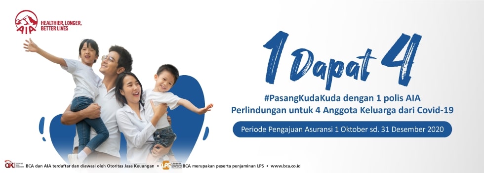 Sudahkah Anda terproteksi di masa New Normal ini? Yuk #PasangKudaKuda bersama BCA AIA dengan proteksi jiwa dan kesehatan untuk diri maupun keluarga Anda. Dapatkan santunan tunai rawat inap hingga Rp100 juta untuk 4 anggota keluarga hanya dengan membeli 1 Polis AIA.