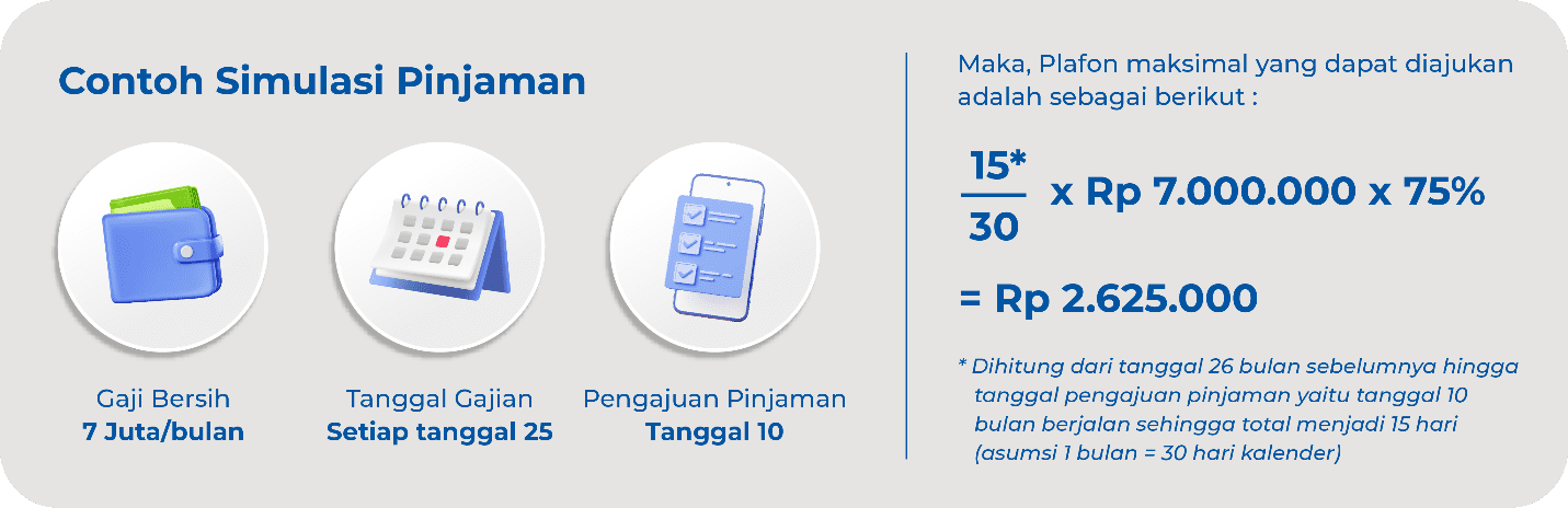 - Plafon maksimal 75% dari total proporsional gaji harian, maksimal gaji karyawan Rp8 juta/bulan