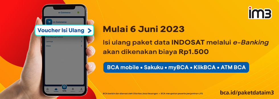 Dalam upaya meningkatkan kualitas layanan dan kenyamanan transaksi, mulai 6 Juni 2023 pembelian paket data Indosat dengan menggunakan e-banking BCA, seperti BCA mobile, Sakuku, myBCA, KlikBCA, dan ATM BCA akan dikenakan Biaya Admin menjadi Rp1.500 per transaksi.