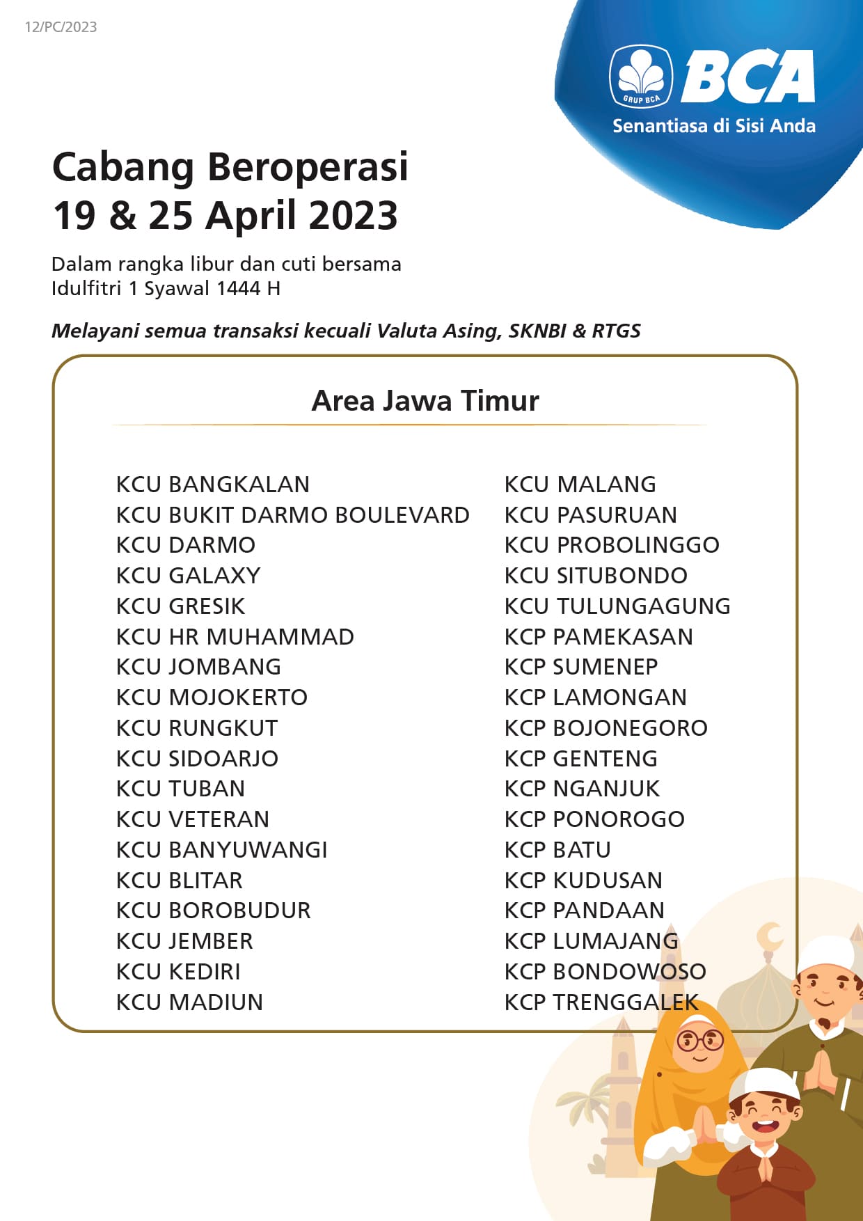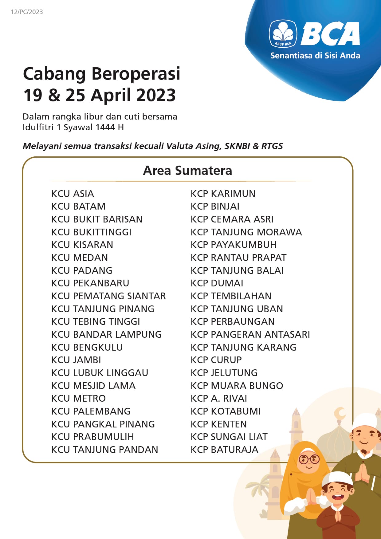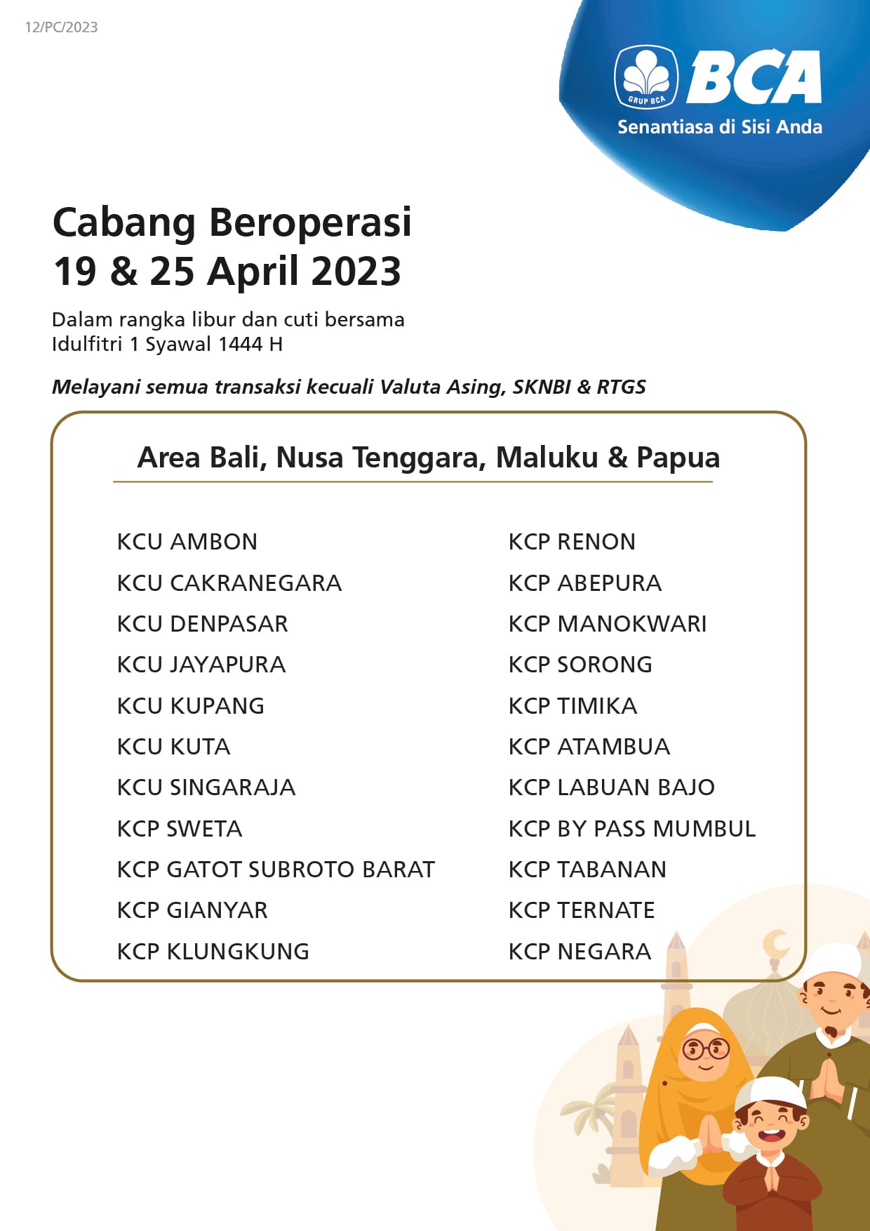 Seluruh cabang BCA tidak beroperasi pada 20-24 April 2023. Khusus tanggal 21 April 2023, beberapa cabang BCA akan beroperasi hanya untuk layanan B2B Pertamina yakni, KCU Bandung, KCU Blitar, KCU Galaxy, KCU Madiun, KCU Matraman, KCU Medan, KCU Palembang, dan KCU Semarang.