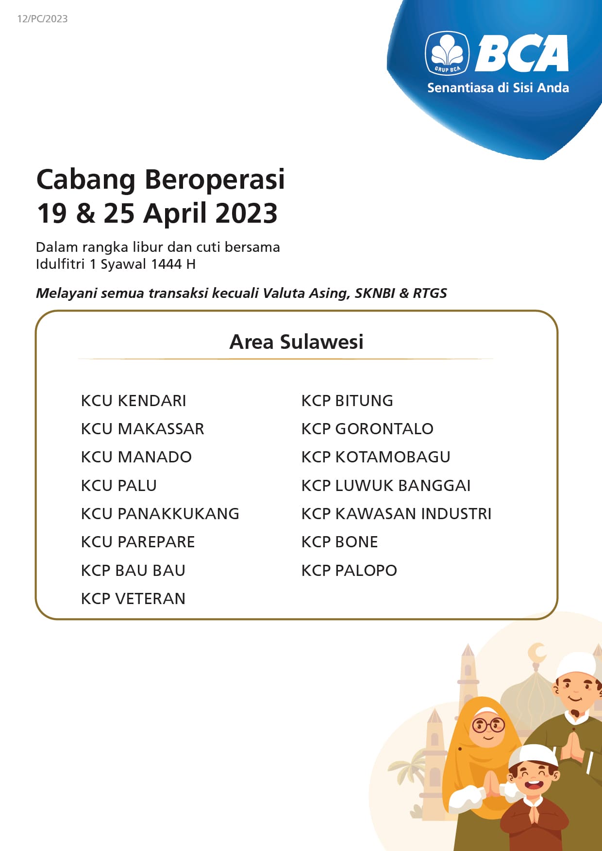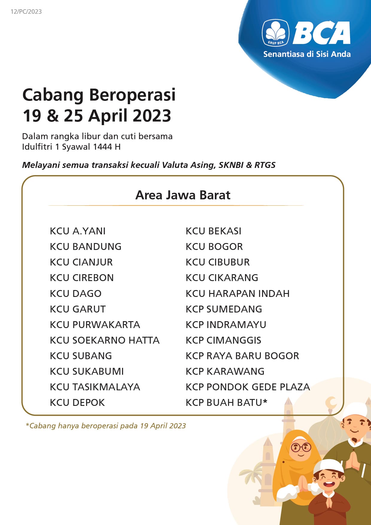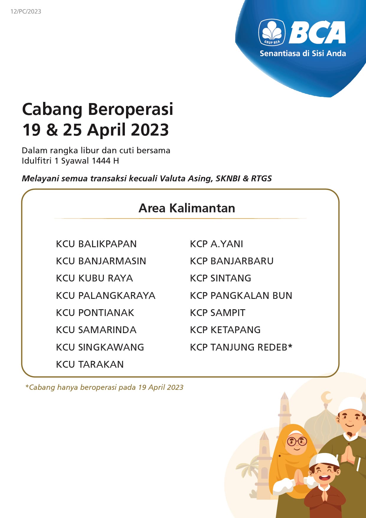 Bagi nasabah yang mungkin memerlukan transaksi perbankan pada periode libur Idulfitri 2023, tidak perlu khawatir, ya. Karena BCA senantiasa hadir di sisi nasabah untuk memberikan layanan terbaik.