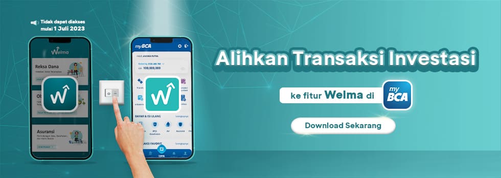 Bagi kamu para investor di BCA, kami informasikan bahwa Aplikasi Welma tidak dapat diakses mulai 1 Juli 2023. Namun, tidak perlu khawatir, kamu tetap dapat berinvestasi & mengakses portofolio melalui fitur Welma di aplikasi myBCA serta menikmati lebih banyak kemudahan akses informasi dan transaksi perbankan di dalam satu aplikasi yaitu myBCA. Selain itu, kamu dapat memperoleh informasi terkait proteksi seperti jiwa, kesehatan dan info proteksi lainnya di bca.co.id ataupun cabang terdekat.