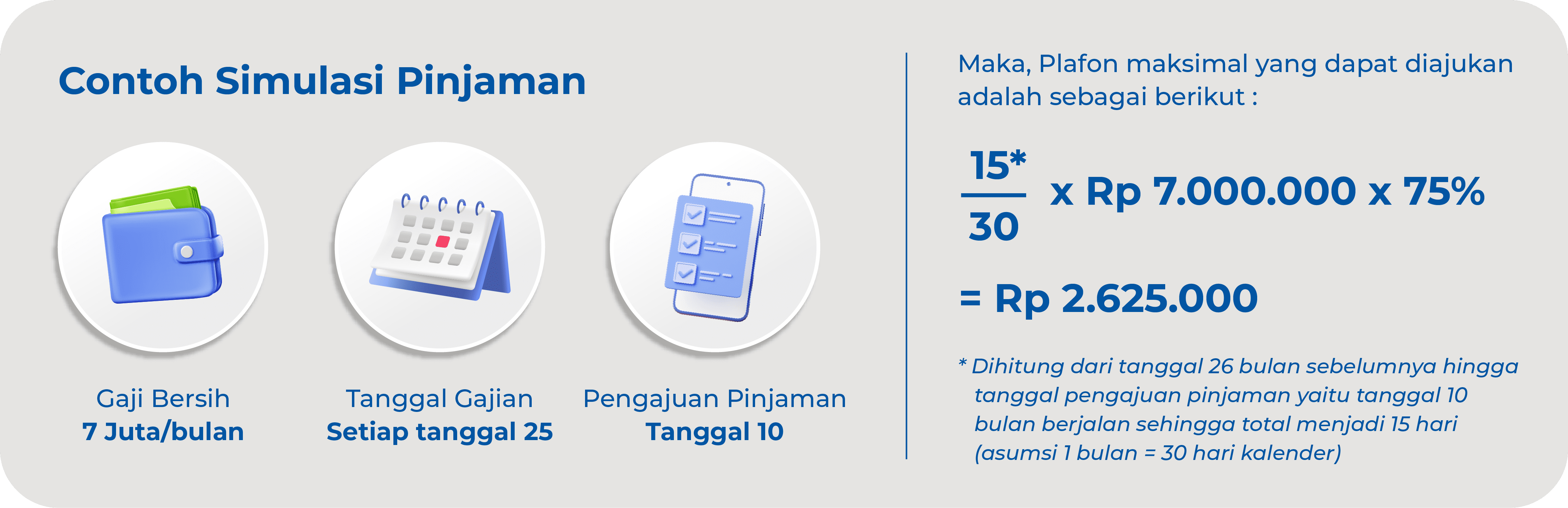 - Plafon maksimal 75% dari total proporsional gaji harian, maksimal gaji karyawan Rp8 Juta/bulan