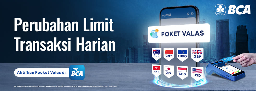 Efektif per tanggal 4 Desember 2024, limit transaksi transfer valas antar mata uang yang berbeda (cross currency) melalui Poket Valas di myBCA ke rekening BCA milik sendiri dan rekening BCA milik nasabah lain, berubah menjadi ekuivalen USD 1 juta/hari per CIN (Customer Identification Number).