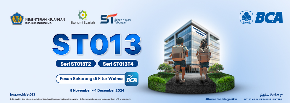 Yuk, turut serta bangun Indonesia dengan berinvestasi ST013 di BCA, karena pemesanan hingga 4 Desember 2024 pukul 10.00 WIB! Informasi lebih lanjut hubungi Halo BCA 1500 888 extension 4 untuk layanan investasi atau mention Twitter BCA: @HaloBCA.