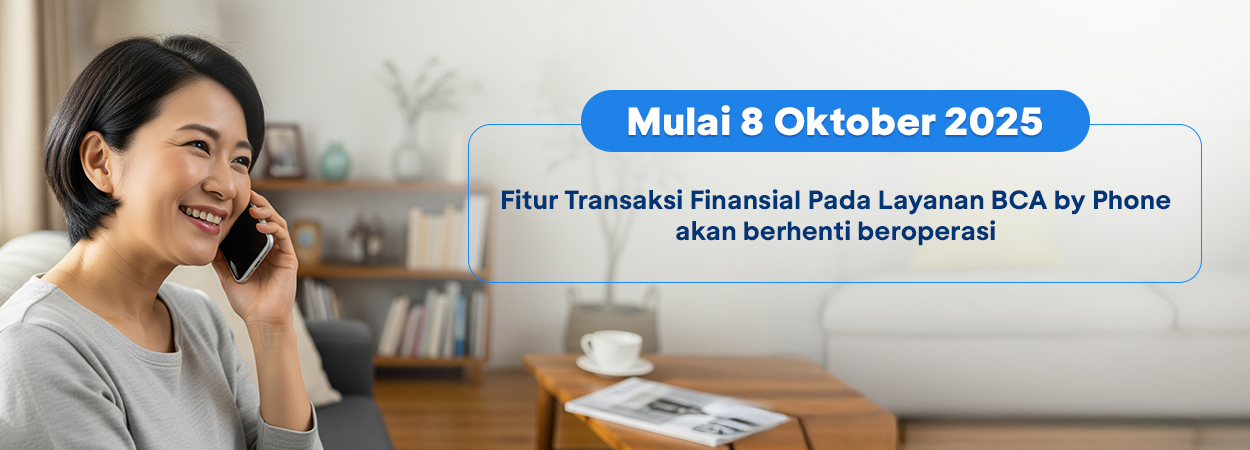 Sebagai informasi, layanan transfer, pembayaran, dan pembelian melalui BCA by Phone akan berhenti beroperasi mulai 8 Oktober 2025. Layanan BCA by Phone lainnya, seperti informasi saldo, mutasi rekening, dan layanan non-transaksional lainnya tetap dapat digunakan seperti biasa.
