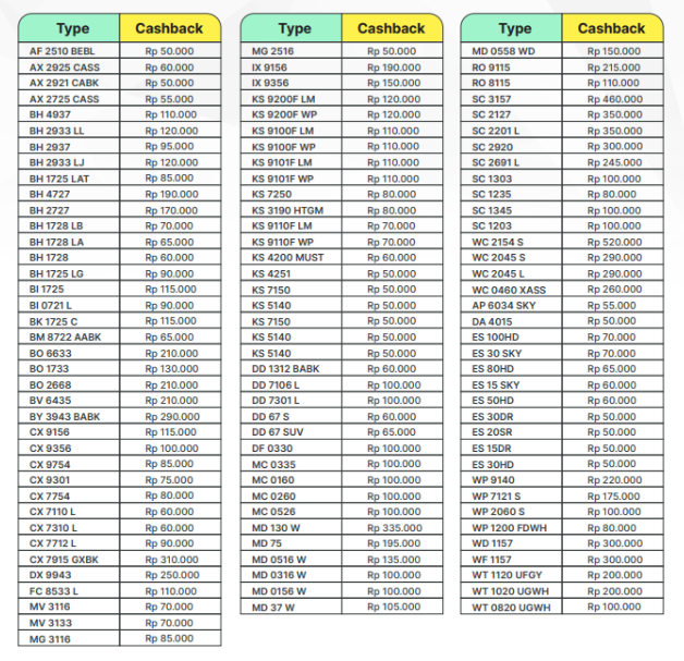 - Nominal cashback berlaku sesuai ketentuan cashback yang berlaku pada setiap produk: