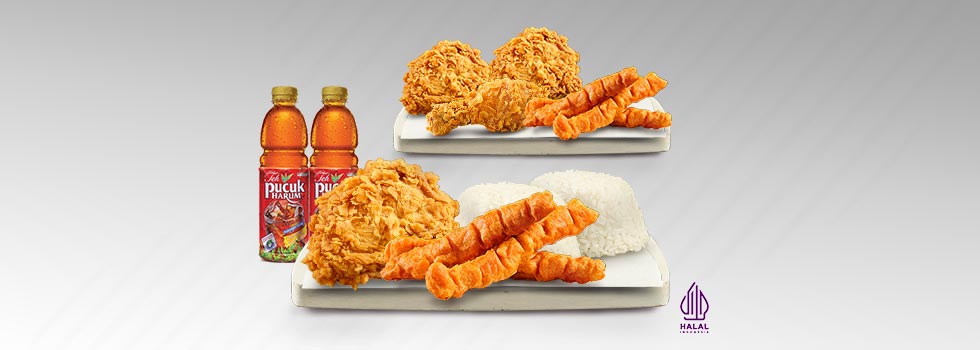 - Berlaku untuk paket khusus: 1 Ayam (Dada/Paha Atas) + 3 Chicken Strips + 2 Nasi + 2 Teh Pucuk Harum