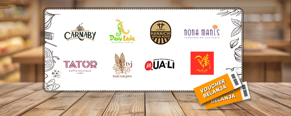 - Dapatkan lucky dip berhadiah voucher Rp25 ribu, Rp50 ribu, Rp100 ribu, Rp200 ribu atau Rp500 ribu di Carnaby, Daun Lada, Hanaichi, Nona Manis, Quali, Taste Van Java & Wee Nam Kee