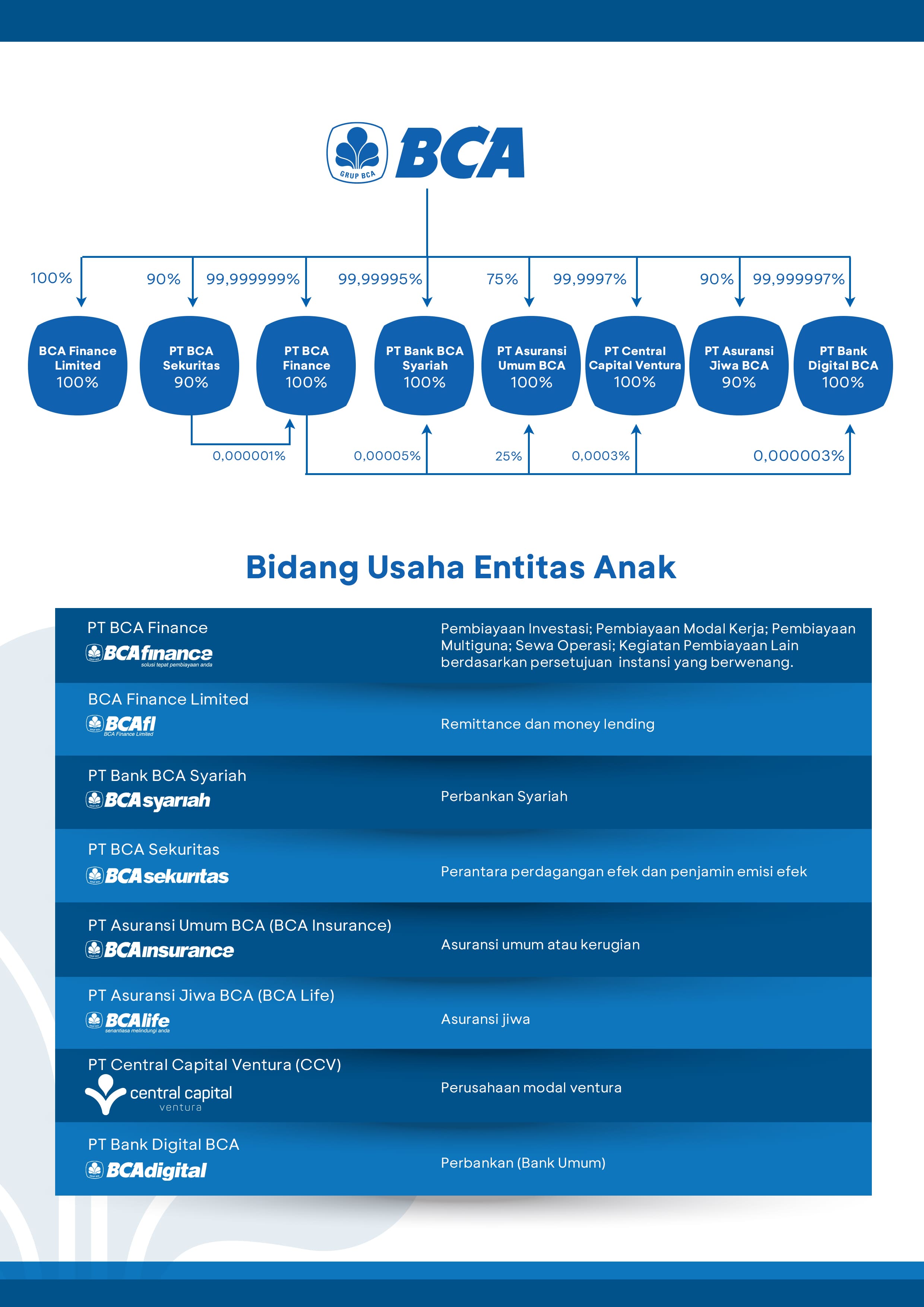 BCA memiliki konglomerasi keuangan yang terdiri dari beberapa perusahaan anak dengan kinerja dan reputasi yg baik. Struktur Konglomerasi Keuangan BCA dan kepemilikan BCA terhadap Perusahaan Anak dapat dilihat dengan mengklik link di bawah ini.