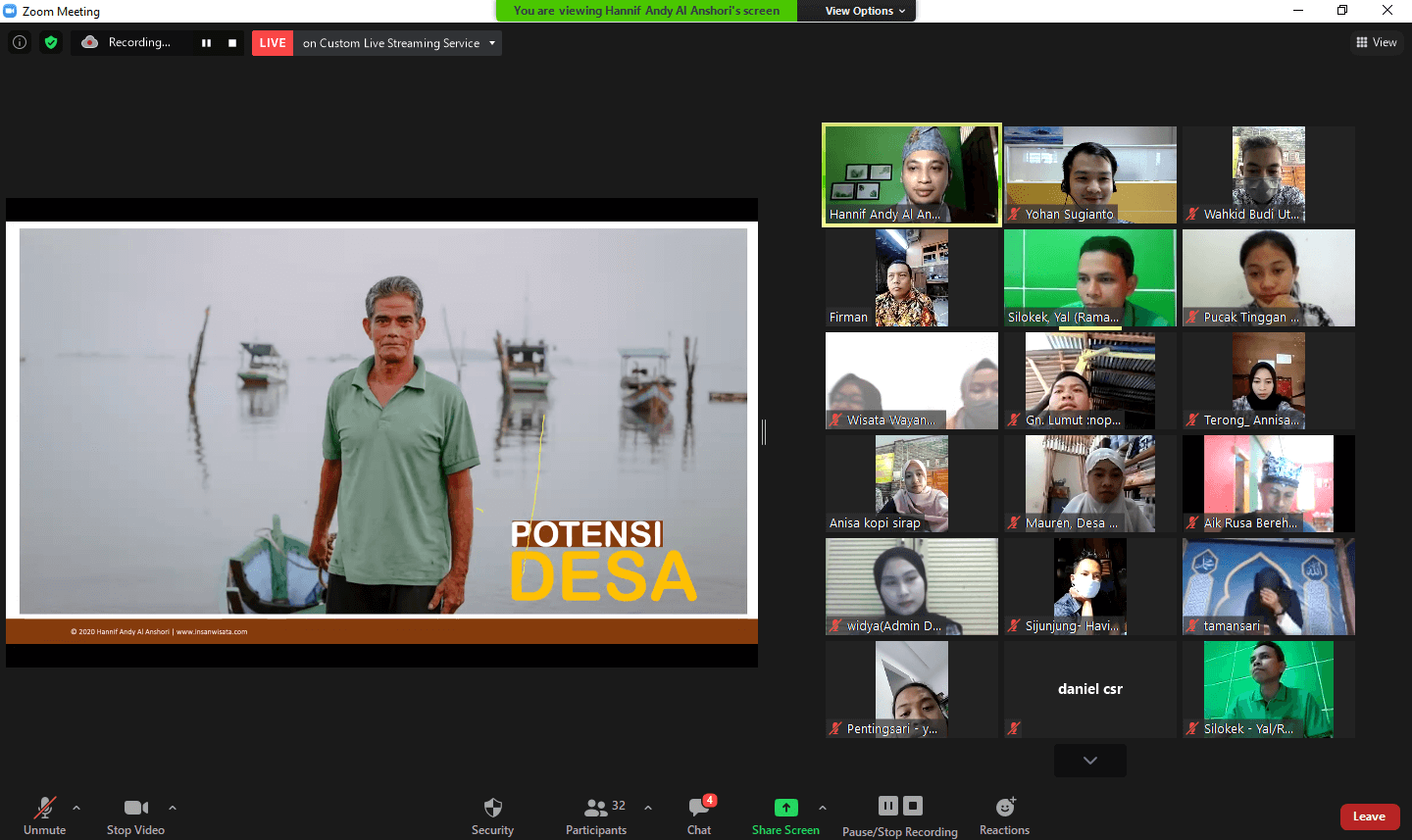 BCA bersama Desa Wisata Institute menggelar Workshop Digital Marketing 2020 secara virtual yang terdiri dari 4 topik, yaitu Creative Storytelling, Optimation Instagram, Website & Search Engine Optimation, serta Google my Business & Partnership. Pembelajaran Creative Storytelling telah terlaksana pada Sabtu (05/09), dengan mengundang Konsultan Pariwisata Hannif Andy Al-Anshori sebagai pengajar. Gelaran yang diikuti secara antusias oleh 33 peserta dari 12 Desa Wisata Binaan BCA ini turut dihadiri oleh Vice President CSR BCA Ira Bachtar.