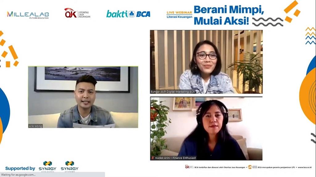 Jakarta, 1 Desember 2020 – Pemahaman akan pengelolaan keuangan pribadi bagi generasi muda menjadi ilmu yang berharga untuk merasakan financial freedom di masa depan. Melihat kondisi tersebut, BCA serta didukung penuh oleh Otoritas Jasa Keuangan berkomitmen untuk fokus memberikan edukasi literasi keuangan bagi generasi muda. Kali ini, komitmen tersebut diwujudkan melalui kegiatan Webinar Literasi Keuangan dengan tajuk “Beranu Mimpi Mulai Aksi”, yang merupakan juga bagian dari peringatan Hari Literasi Keuangan Nasional yang jatuh pada tanggal 19 November.