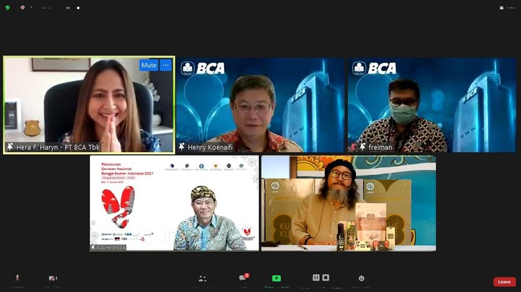 Media Briefieng BCA Mendukung Gerakan Nasional Bangga Buatan Indonesia - Direktur BCA Henry Koenaifi (atas tengah), EVP Secretariat & Corporate Communication BCA Hera F. Haryn (atas kiri), Executive Vice President Commercial Business & SME BCA Freddy Iman (atas kanan), Kakanwil IV BCA Hendrik Sia (bawah kiri) dan Pemilik Minyak Kutus-Kutus Bambang Pranoto (bawah kanan) pada saat media briefing BCA Mendukung Gernas BBI pada Senin (11/01). BCA berkomitmen untuk meningkatkan pertumbuhan ekonomi nasional, khususnya melalui sektor UMKM. Oleh karena itu, BCA turut mengambil bagian dalam Gerakan Nasional Bangga Buatan Indonesia (Gernas BBI) yang dicanangkan oleh pemerintah. Kolaborasi dari kesamaan tujuan dan gerakan ini bakal semakin memperkuat BCA dalam mendorong masyarakat untuk semakin mencintai, mengembangkan, dan meningkatkan nilai tambah produk lokal dan bangga dengan buatan Indonesia.