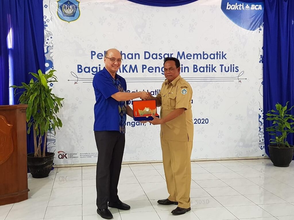 BCA Gelar Pelatihan Dasar Membatik Bagi UMKM Pengrajin Batik Tulis Lamongan - Kepala KCU BCA Gresik Didi Edisurya (kiri) dan Kepala Dinas Tenaga Kerja Kabupaten Lamongan Hamdani Azhari (kanan) bertukar cinderamata saat pembukaan acara Pelatihan Dasar Membatik UMKM Pengrajin Batik Tulis yang diadakan oleh BCA melalui program Bakti BCA di Lamongan, Senin (16/3). Pelatihan yang diikuti oleh 15 UMKM lokal ini bertujuan mempersiapkan tenaga UMKM yang handal serta tetap dapat mempromosikan batik tulis Lamongan yang disesuaikan dengan perkembangan zaman. Peserta diberikan penjelasan mengenai produk-produk perbankan yang dapat mendukung kelancaran usaha, antara lain mesin EDC, produk tabungan, fitur-fitur digital banking dan lain-lain.