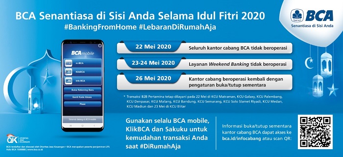 Jakarta, 20 Mei 2020 – Pada momen Hari Raya Idul Fitri 2020, PT Bank Central Asia Tbk (BCA) senantiasa berkomitmen untuk memberikan service excellence bagi seluruh nasabah setianya. Berikut penyesuaian kegiatan operasional kantor cabang BCA selama momen Idul Fitri 2020: