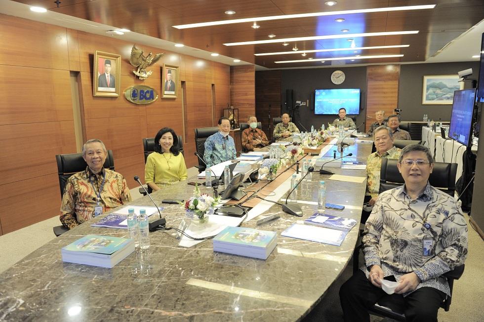 RUPST BCA 2021 – Presiden Komisaris BCA Djohan Emir Setijoso (keempat dari kiri), Presiden Direktur BCA Jahja Setiaatmadja (ketiga dari kiri) beserta jajaran komisaris dan direksi lainnya di sela-sela penyelenggaraan Rapat Umum Pemegang Saham Tahunan (RUPST) di Jakarta, Senin (29/03). RUPST memberikan persetujuan atas penetapan penggunaan Laba Bersih Perseroan selama tahun buku 2020 sebesar Rp27,1 triliun, diantaranya untuk dibagikan sebagai Dividen Tunai sebesar Rp530,- per saham. Dividen tunai tersebut sudah termasuk dividen interim sebesar Rp98 per saham yang telah dibagikan pada tanggal 22 Desember 2020. Pembagian dividen tersebut di atas adalah sebesar 48% dari total Laba Bersih tahun buku 2020.