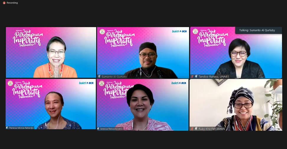 Webinar Jejak Perempuan Inspiratif Indonesia – (atas, kiri-kanan) EVP CSR BCA Inge Setiawati, Direktur Nusantara Institute Sumanto Al Qurtuby, Dekan Fakultas Ilmu Keolahragaan Universitas Negeri Semarang Tandiyo Rahayu (bawah, kiri-kanan) Pelopor terapi plasma konvalesen di Indonesia Theresia Monica Rahardjo, Direktur Executive Yayasan Usaha Mulia Vanessa Reksodipoetro dan Direktur Asian Muslim Action Network (AMAN) Indonesia Ruby Kholifah turut hadir dalam Webinar Jejak Perempuan Inspiratif Indonesia. Dalam memperingati Hari Kartini, salah satu tonggak gerakan emansipasi wanita di Indonesia, bekerja sama dengan Nusantara Institute, BCA mengadakan webinar bertajuk “Jejak Perempuan Inspiratif Indonesia,”.