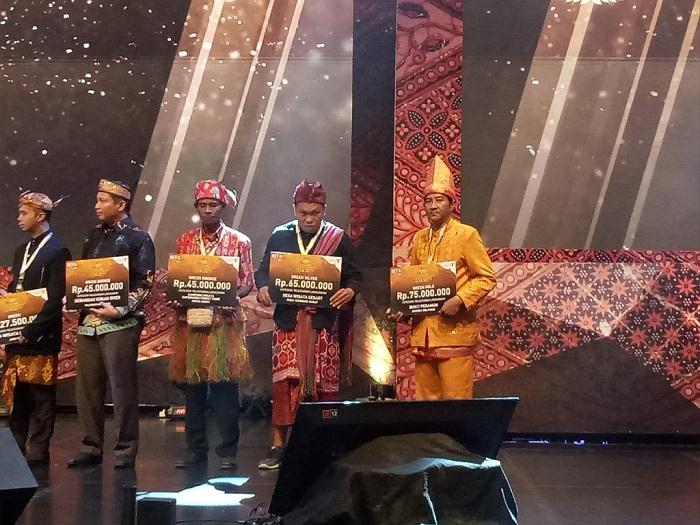 Desa Binaan Bakti BCA: Bukit Peramun Raih ISTA 2019 - Menteri Pariwisata Republik Indonesia (RI) Arief Yahya (kiri) menyerahkan simbolis penghargaan Green Gold kategori Pelestarian Lingkungan kepada Ketua Komunitas Arsel sekaligus penanggung jawab Desa Binaan Bukit Peramun Adie Darmawan (kanan) dalam ajang ISTA - Indonesian Sustainable Tourism Awards 2019 yang digelar pada Kamis (26/9) di Jakarta. Desa Bukit Peramun, Bangka Belitung ini merupakan salah satu desa binaan yang dikembangkan oleh Bakti BCA melalui serangkaian kegiatan pembinaan dan pemberdayaan masyarakat yang berorientasikan kualitas pelayanan yang unggul kepada wisatawan.