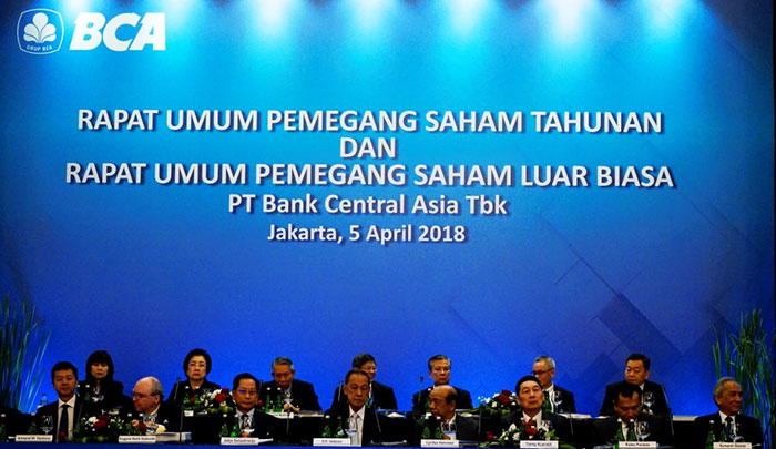 Jakarta, 5 April 2018 – PT Bank Central Asia Tbk (“Perseroan”) hari ini melaksanakan Rapat Umum Pemegang Saham Tahunan (“RUPST”) dan Rapat Umum Pemegang Saham Luar Biasa (“RUPSLB”). RUPST telah mengambil keputusan-keputusan antara lain persetujuan atas Laporan Tahunan, Laporan Keuangan Perseroan dan Laporan Tugas Pengawasan Dewan Komisaris Perseroan. Dengan disetujuinya laporan-laporan tersebut, RUPST memberikan pelunasan dan pembebasan tanggung jawab (acquit et decharge) kepada anggota Direksi dan Dewan Komisaris atas tindakan pengurusan dan pengawasan yang dilaksanakan sepanjang tahun buku yang berakhir pada 31 Desember 2017.