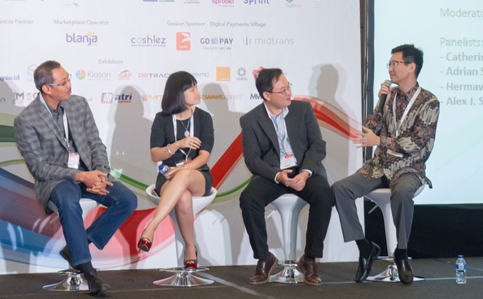 (Kiri-Kanan) Direktur Telkom Abdus Somad Arief, CEO Alfacart.com Catherine Sutjahyo, CEO Lippo Digital Group Adrian Suherman, dan Executive Vice President Information Technology BCA Hermawan Thendean menjadi narasumber dalam diskusi panel yang bertemakan “Omni-channel Retailing: Digital Transformation, Customers First”. Acara Internet Retailing Expo diadakan karena potensi yang sangat besar dari pasar ritel internet, yang telah berkembang sangat signifikan di Indonesia dalam beberapa tahun terakhir.