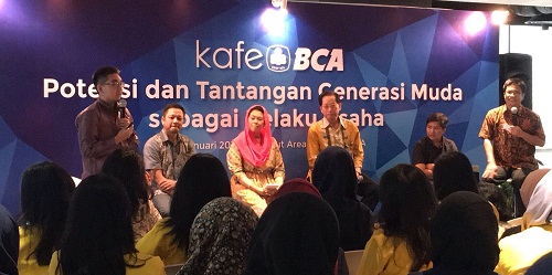 Melalui talkshow bertajuk Kafe BCA yang mengusung tema “Potensi dan Tantangan Generasi Muda sebagai Pelaku Usaha” di Jakarta, Rabu (13/1), BCA mengundang sejumlah kaum muda yang sukses dengan ide kreatifnya menjadi pemberi makna bagi masyarakat, di antaranya Yasa Paramita Singgih melalui personal development yang menginspirasi generasi muda dengan bisnis fashion Men’s Republik yang dirintis saat ia berusia 15 tahun dan Elihu Nugroho melalui service excellence yang menawarkan metode mencuci mobil tanpa air demi mendukung gerakan menghemat air bersih.