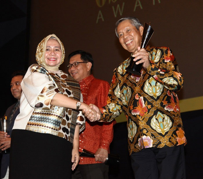LIFETIME ACHIEVEMENT - Presiden Direktur PT Bank Central Asia Tbk (BCA) Jahja Setiaatmadja (kanan) menerima penghargaan Lifetime Achievement dalam Obsession Award 2016 yang diserahkan CEO dan Chairman Obsession Media Group Usamah Hisyam (kiri) di Jakarta (2/3). Penghargaan ini diberikan atas dedikasi, dan inspirasinya bagi perusahaan, negara, lingkungan sekitar, dan khalayak luas.