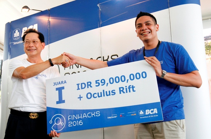 Presiden Direktur PT Bank Central Asia Tbk (BCA) Jahja Setiaatmadja (kiri) menyerahkan hadiah berupa uang tunai Rp59 juta dan Oculus Rift kepada pemenang utama Finansial Technologi Hackathon (Finhacks) 2016 #HackbyTheBeach Fariz Tadjoedin (kanan) dengan aplikasi Chatbanking. Aplikasi yang dihasilkan para pemenang akan memberikan sumbangsih pada kemajuan teknologi eWallet yang bermanfaat bagi nasabah dalam memenuhi kebutuhan transaksi yang aman dan nyaman.