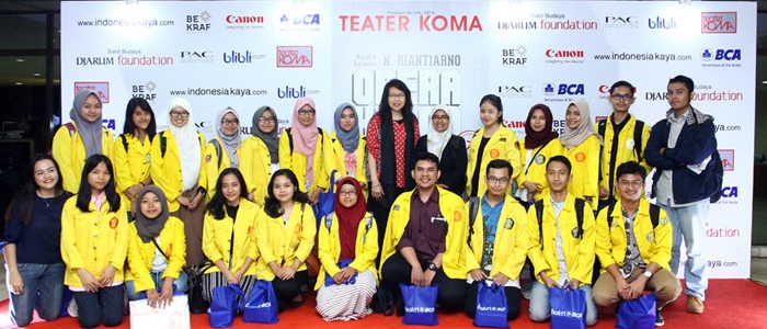 Jakarta, 11 November 2016 - PT Bank Central Asia Tbk. (BCA) terus mewujudkan komitmennya untuk mendorong pembentukan karakter generasi muda melalui seni dan budaya dengan mengundang penerima beasiswa Bakti BCA dari Universitas Indonesia, peserta Program Pendidikan Akuntansi (PPA) Non Gelar, peserta Program Pendidikan Teknik Informatika (PPTI) Non Gelar dan anak-anak karyawan BCA untuk bersama-sama menyaksikan pertunjukan seni teater. BCA mengajak ± 60 mahasiswa tersebut untuk menyaksikan pertunjukan karya Teater Koma yang ke 146 berjudul Opera Kecoa.