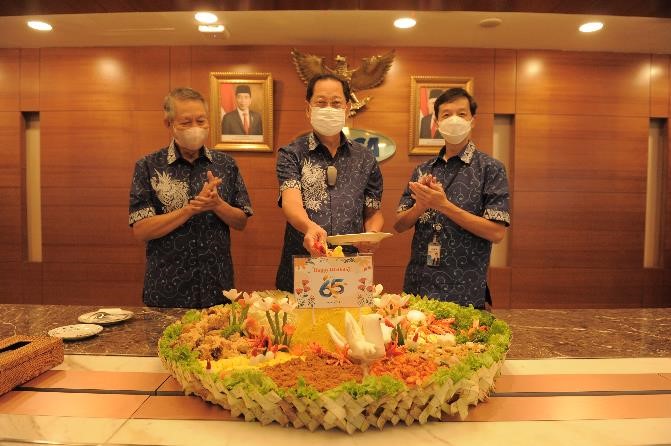 Perayaan Hari Ulang Tahun (HUT) BCA ke-65 – Presiden Direktur BCA Jahja Setiaatmadja (tengah) didampingi Wakil Presiden Direktur BCA Suwignyo Budiman (kiri) dan Wakil Presiden Direktur BCA Armand Wahyudi Hartono (kanan) secara simbolis memotong tumpeng di tengah acara perayaan HUT BCA ke-65 di Jakarta, Senin (21/02).