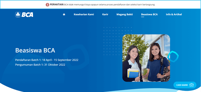 Program beasiswa yang digelar oleh BCA telah berlangsung sejak tahun 1996. Tahun ini BCA menggelar pendaftaran untuk batch I dimulai dari tanggal 18 April hingga 15 September 2022. Sementara itu, pengumuman peserta yang berhasil lolos ke tahap selanjutnya akan dilakukan pada 31 Oktober 2022. Karena masih dalam masa pandemi, seluruh proses tahapan beasiswa ini digelar secara online (kecuali Tes Kesehatan). Informasi mengenai tahapan seleksi beasiswa ini dapat diakses melalui karir.bca.co.id/beasiswa-bca.