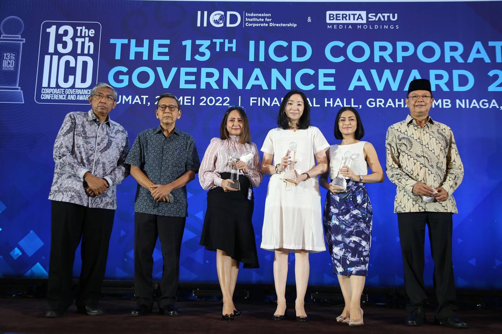 BCA Raih Penghargaan di Ajang The 13th IICD Corporate Governance Award 2022 - Executive Vice President Secretariat & Corporate Communication BCA Hera F. Haryn (ketiga dari kiri) menerima penghargaan Top 50 Emiten Kapitalisasi Pasar Terbesar (Big Cap PLCs) dengan Praktek Tata Kelola Perusahaan Terbaik yang diserahkan oleh Boediono, Wakil Presiden RI periode 2009-2014 (kedua dari kiri), Ketua Pengurus IICD Sigit Pramono (kanan) dan Ketua Komite Nasional Kebijakan Governance (KNKG) Mardiasmo (kiri) di Jakarta pada (27/05). BCA dinilai sebagai salah satu perusahaan publik terbaik yang dalam komitmennya menjalankan tata kelola perusahaan atau Good Corporate Governance (GCG). Penghargaan ini secara khusus memberikan apresiasi terhadap 50 perusahaan publik dengan kapitalisasi pasar terbaik di Indonesia.