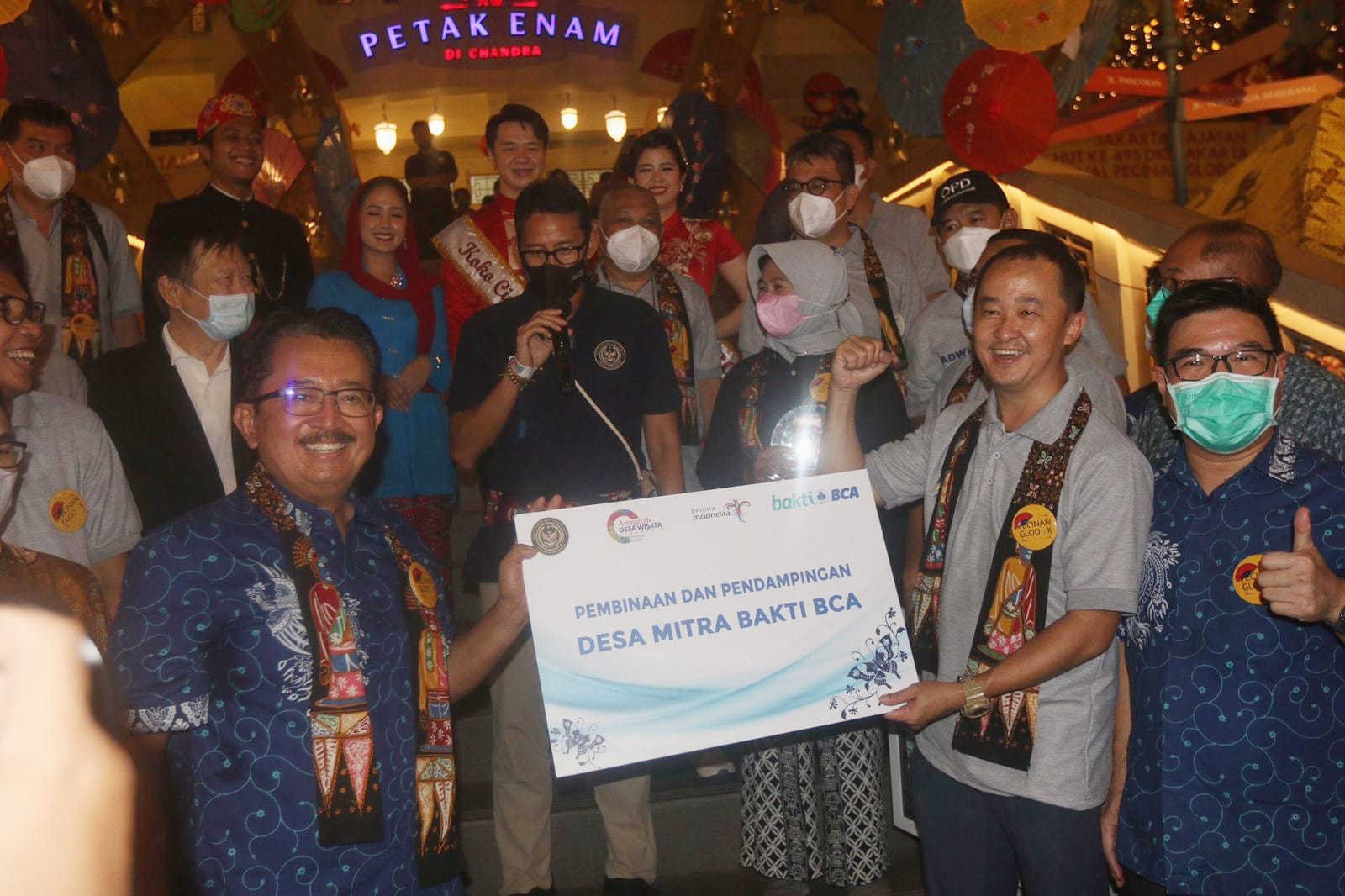 Desa Mitra Bakti BCA di Pecinan Glodok – Direktur BCA Antonius Widodo (kiri) didampingi oleh Kepala Kantor Wilayah X Lukman (kanan) dan ketua Pokdarwis Desa Wisata Pecinaan Glodok Ng Andre (tengah) dalam seremoni Desa Mitra Bakti BCA di Pecinan Glodok yang diresmikan oleh Menteri Pariwisata dan Ekonomi Kreatif Sandiaga Uno pada Minggu (26/06). BCA berkomitmen untuk memberikan pembinaan dan pendampingan untuk pengembangan desa bagi desa-desa yang terpilih sebagai Desa Mitra Bakti BCA.